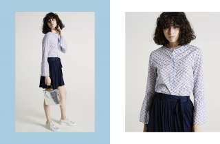 It is a women’s blouse in printed Albini cotton muslin, in very light fabric featuring loose plain weave and a lively pattern in white and blue inspired by spring.