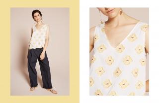 Ginny is a simple sleeveless blouse with an innocent, pure feel to it. And this is its strong point, because sometimes simplicity is worth more than a thousand trappings. Slightly flared, it folds gently over the hips with a deep V-neck, both front and back. This top is made of fine white cotton with a contrasting yellow or pink floral pattern. In fact, the delicate floral pattern is worked with fil coupe, a particular technique that involves cutting the threads of the fabric, making the garment soft to the touch.