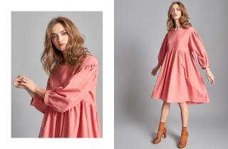 Gaia and Eleonora on the other hand, have larger volumes that add a romantic always-glam touch. Gaia is an elegant shirt dress that stands out for its straight, three-quarter sleeves and clean, rounded neckline. The particular ruffled front and concealed welt pockets on the hip create a more dynamic effect on the skirt. The light stretch poplin material alternates two shades of grey for a striped result. Gaia is a cool dress for those occasional days of milder weather, maybe under a leather jacket and with black ankle boots to create an urban chic result. Eleonora is a dress in the same shape as Gaia, but with puffed sleeve and a knee-length bell skirt. The warm tones of soft pink flannel make this the perfect dress to add a touch of colour to the early winter season.
