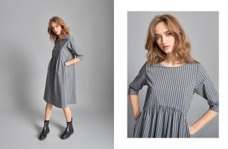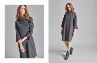 Beatrice with its no-fuss, simple design is a women’s dress that takes its inspiration from the tunic, standing out for its egg-shaped design, wide cowl collar and three-quarter sleeves with small slits in the cuffs. This dress is made in soft cotton flannel with a deep grey pinstripe, making it perfect for colder weather as well as for office wear.