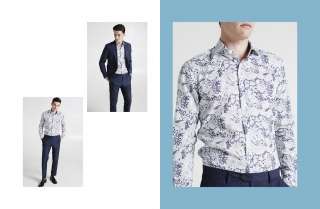 A Liberty of London men’s shirt that boldly showcases the colours of spring and summer: blue and white, woven together in a bold, bright floral pattern.