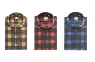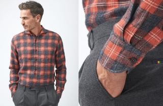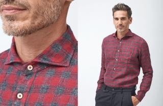 If your preference is for a more formal check, this tartan shirt in reds and greys, with new-design cutaway collar and rounded cuffs, is perfect over a dark pair of trousers with a small check, a matching waistcoat, and a pair of dark brogues, for casual-chic results. And if you would rather have a brighter palette, we have this flannel shirt in yellow ochre and grey, paired with green trousers, a cashmere cardigan in deep grey and a classic pair of dark desert boots, for an outstanding look in terms of style and elegance.