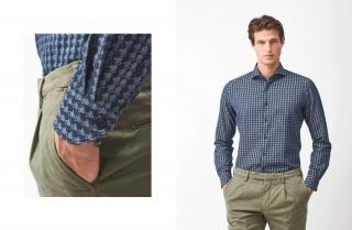 Maybe you’d miss wearing dark blue? This blue shirt with houndstooth pattern and light blue inserts is perfect for a sporty look together with dark blue chinos, a coordinated destructured blazer, a pair of light-coloured sneakers and a blue slimfit quilted jacket, to create a look with a contemporary flavour.
