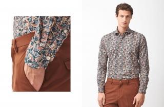 Are you a fan of floral patterns? Remember to choose a coat or jacket that repeats even just one of the colours of the shirt, so as to create an element of uniformity in your look. One example could be this splendid patterned shirt in shades of dark green, pale blue and orange; we can match it with a great pair of slimfit jeans, a dark green jacket, tone on tone, a pair of dark-coloured Derby shoes and a pashmina in orange tones, to give a metropolitan dandy look.