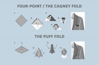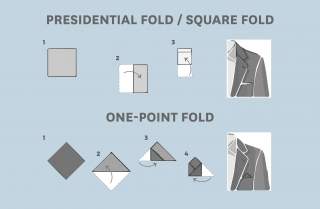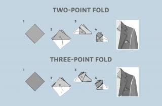 For office wear or important work appointments, you can choose a point fold (single, two-point, or three-point), by folding the handkerchief into a triangle and leaving the point (or points) to be seen from the pocket top.