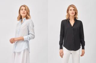 If you’re looking at refined elegance, then a silk shirt can add a twist to any outfit, from a more casual style, like this pale blue shirt, a simple, iconic item with a soft spread collar and regular fit, to pair with some jeans. Or more chic results can be created with this black shirt with small collar and classic button fastening, worn over white flared linen trousers and a pair of wedge sandals.