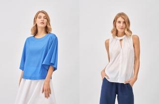One of the most versatile models in the Revolution Silk collection is the blouse with tear-drop opening on the front and turtleneck collar, available in a classic white or a bright coral red, that is just perfect over linen trousers in cobalt blue and a sandal that picks up on the colour of the top. For a more casual chic look, we could opt for a light blue blouse with round neck and bell sleeves, paired with a white midi and a pair of beige sandals with heel.