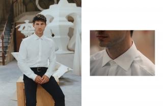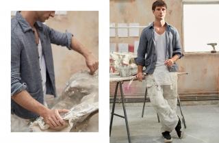 For Nick Hornby, elegance “is about a balanced image”. The outfits chosen for the shots taken for L’Officiel Hommes all have Xacus shirts as their key theme and here they show the twin sides of his personality: on one hand, the informal sculptor at work, needing inspiration and physical effort; on the other, the formal young man moving between meetings, photo tests, computer renders, presentations and parties.