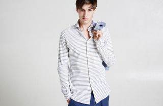 In the Beluga Washed collection, the printed shirts that were at the forefront in past seasons give way to the return of the stripe, presenting itself in a new guise with different manufacturing techniques. Striped shirts on a very light twill mélange base, as well as indigo stripes worked in jacquard or jersey shirts with barré stripes (horizontal rather than vertical).
