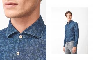For lovers of a more casual look, we have this shirt in pure Texan style in a dark denim with snap fasteners, flap pockets and a pointed yoke. Perfect when creating a total denim look with jeans in a slightly contrasting colour, a lighter denim jacket and a pair of black sneakers. And for something more ‘out there’, why not choose a patterned shirt with a floral print on an indigo yarn? Wear it over a grey T-shirt, with a pair of deep green chinos and white sneakers, for a look where metropolitan meets glam.
