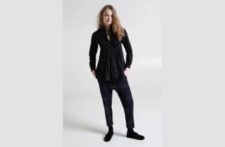 A black shirt in pleated cotton, with an empire waist.