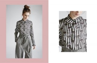 The women’s silk shirt has a printed stripe with animal patterns, as in this case with a badger design. A decidedly elegant and sophisticated shirt thanks to the details at the neck and cuff framed by pleats. The predominant colours are black and white, perfect for combining with wide-legged woollen cropped trousers.