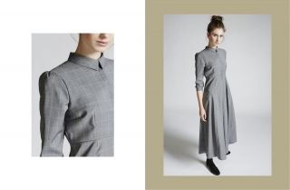 A check-pattern dress created in very lightweight wool and cotton, with three-quarter sleeves. This garment shows off the female form sparingly, falling softly and discreetly over the silhouette.