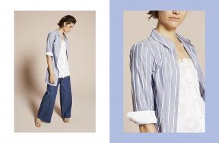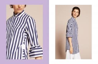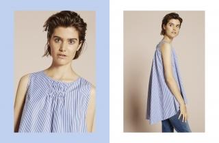 In a more sober vein we have Fanny: this is the classic-cut women’s shirt, with length to low hip and long, soft sleeves tapered at the wrist. The texture on a light grey base and the thin white stripes make this shirt ideal for wearing in the office to give a fresh, professional look. Finally, there’s Renè, the bell-shaped sleeveless shirt characterized by alternating vertical white and light blue stripes. It’s the details that make the difference: the smocking on the front of the neckline makes this shirt perfect for any occasion, even the most dressed-down ones.