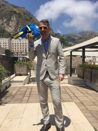 Greetings from Gabriele Lele Corsi from Trio Medusa wearing our shirt at Taormina Film Fest today!