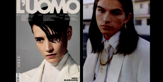 Passiamo a Vanity Fair che descrive un nuovo tipo di eleganza maschile mescolando capi sportivi, dai colori brillanti e linee rilassate, come sneakers e cappotti oversize in tessuto tecnico, con capi simbolo del menswear tradizionale come la classica camicia bianca. La camicia bianca Xacus la ritroviamo, assieme a giacca e cravatta, anche ne L’Uomo Vogue che propone un freschissimo look total white dall’animo rock.